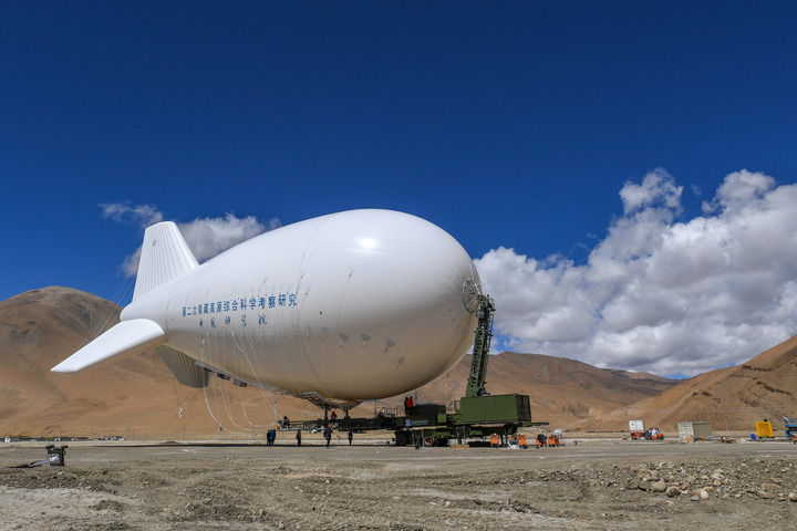 完成充氣后的“極目一號(hào)”Ⅲ型浮空艇在中科院珠峰站附近等待升空(2022年5月12日攝)。新華社記者 姜帆 攝