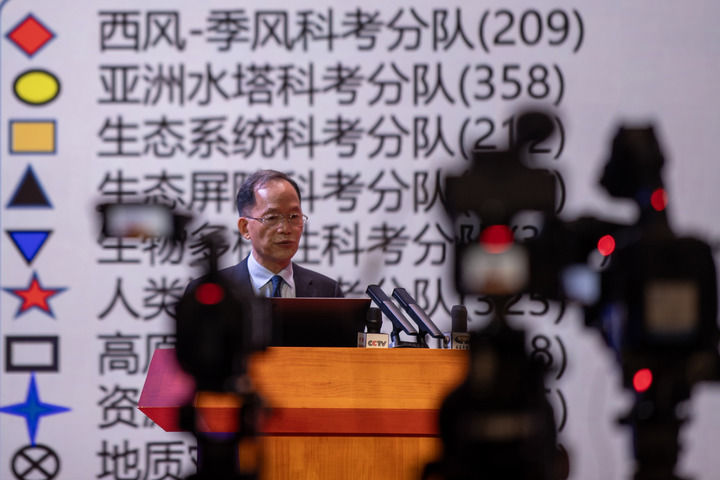 2024年8月18日,第二次青藏科考隊(duì)隊(duì)長(zhǎng)姚檀棟院士在拉薩對(duì)本次科考10大任務(wù)的重要成果進(jìn)行集中發(fā)布。 新華社記者 姜帆 攝