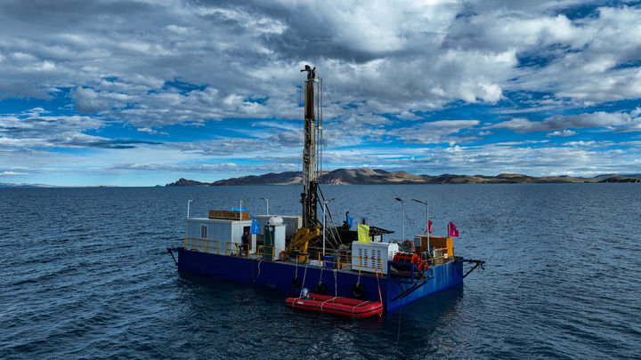 2024年7月11日拍攝的納木錯(cuò)水上鉆探平臺(tái)(無人機(jī)照片)。 新華社記者 晉美多吉 攝