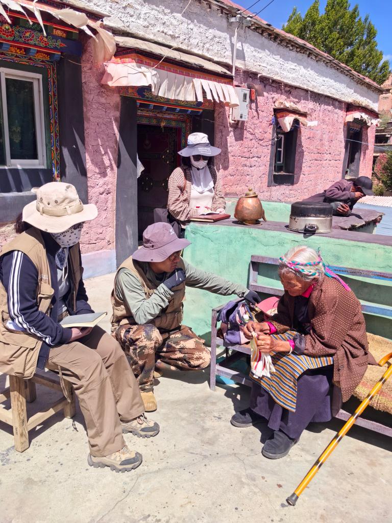 普查隊員在山南市曲松縣曲松鎮(zhèn)瓊嘎村向當?shù)乩先俗稍冊摯鍤v史文化情況。(受訪者供圖)