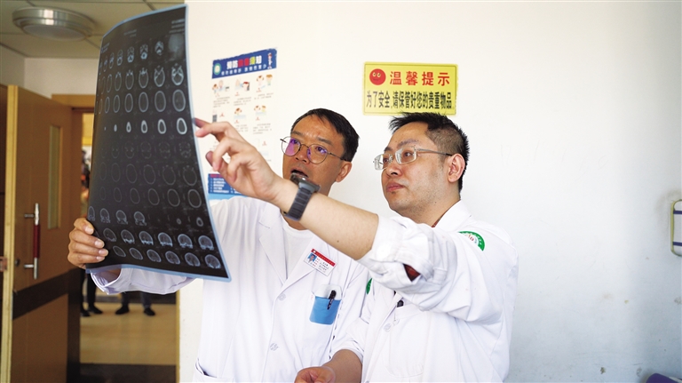 昌都市人民醫(yī)院外二科主任余正強(qiáng)(左)與重慶市第十批援藏干部、昌都市人民醫(yī)院神經(jīng)外科副主任熊偉茗(右)正在討論患者治療方案。