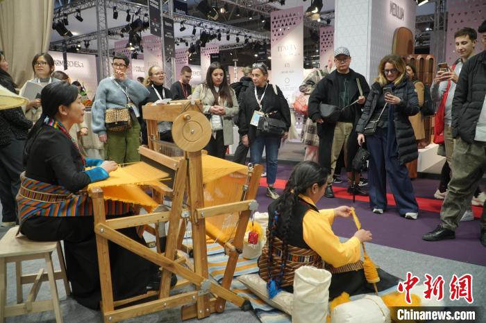 2024年1月,來自中國西藏的傳統(tǒng)氆氌亮相法國巴黎時尚家居設(shè)計展。(受訪者供圖)