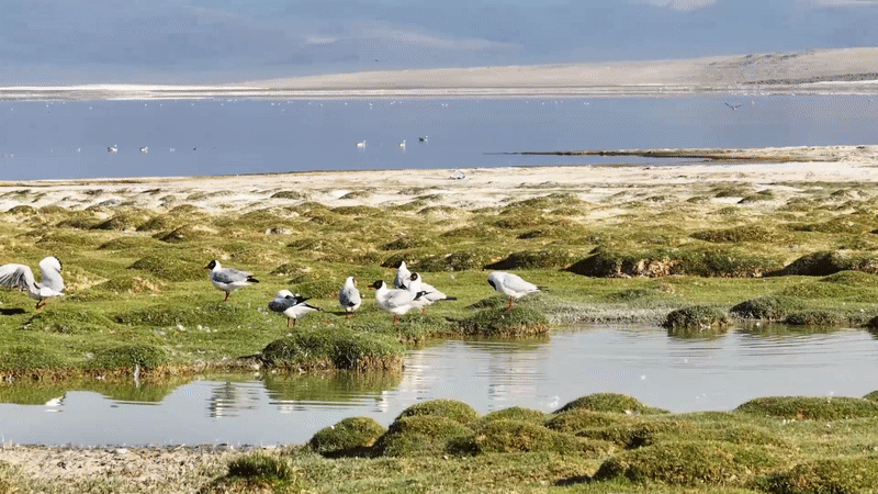 在扎日南木錯(cuò)湖西北處的淡水淺灘區(qū)生長(zhǎng)著茂密的水草和藻類,形成適合鳥類棲息的生態(tài)濕地。