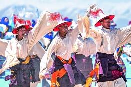 舞蹈演員在納木錯(cuò)開湖活動(dòng)現(xiàn)場表演。新華社發(fā)