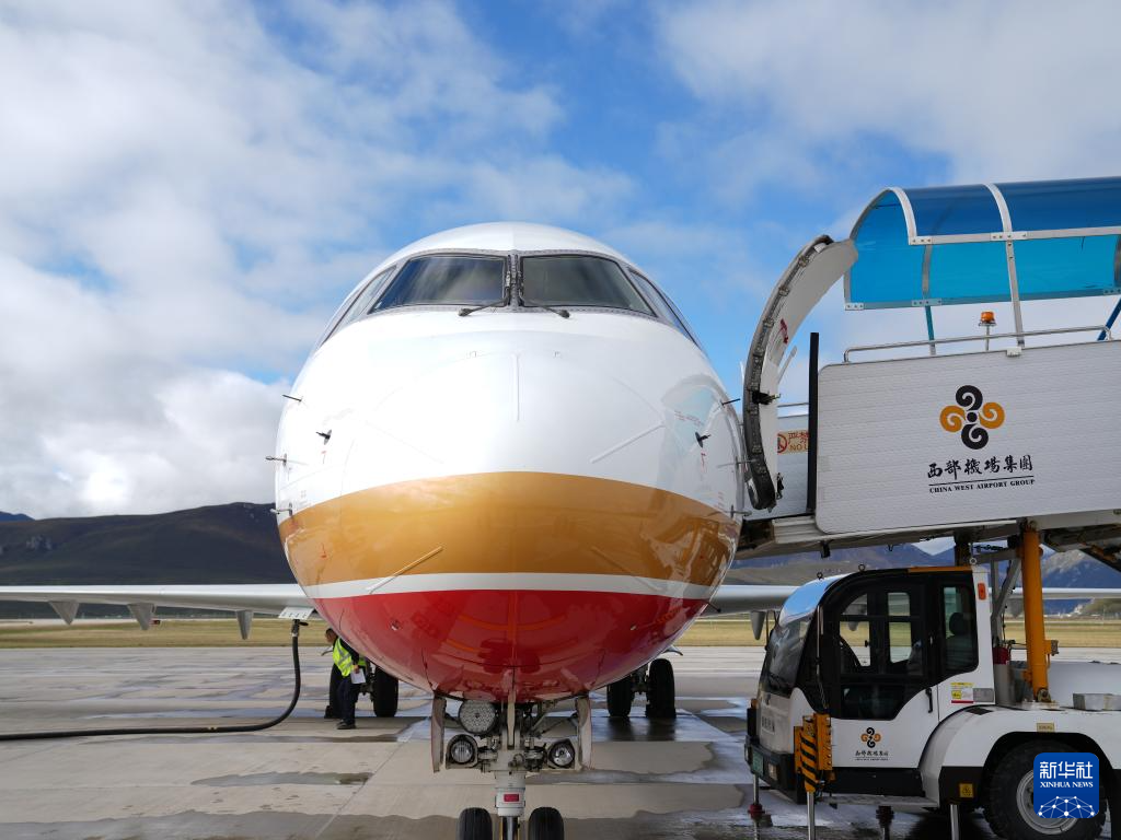 9月21日,國(guó)產(chǎn)商用飛機(jī)ARJ21飛抵青海果洛瑪沁機(jī)場(chǎng)。新華社記者 丁汀 攝