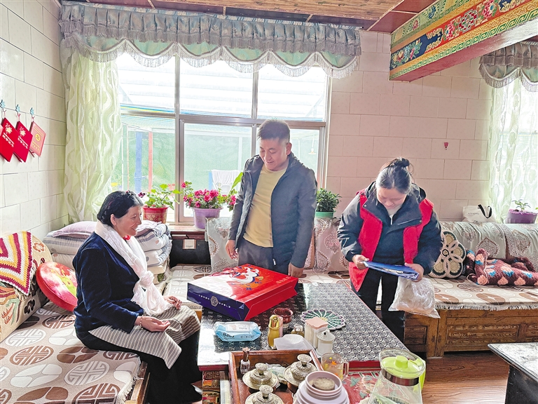圖為亞?wèn)|縣帕里鎮(zhèn)工作人員在民族團(tuán)結(jié)通婚家庭開(kāi)展走訪慰問(wèn)。(本版圖片均由記者 扎西頓珠 楊子彥 旦增嘎瓦 攝)