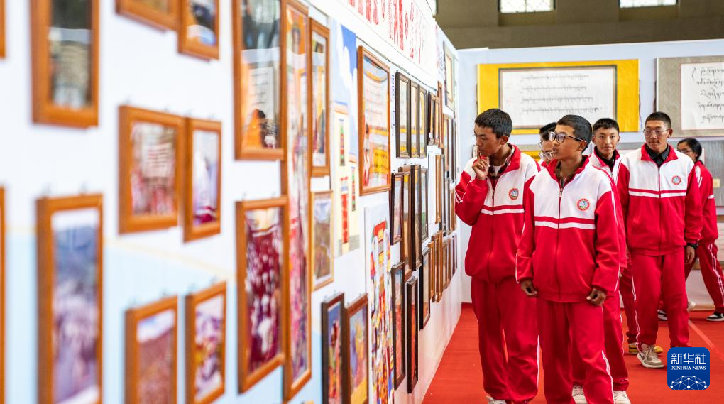 學(xué)生在西藏首屆中小學(xué)生藝術(shù)展演活動獲獎作品展廳內(nèi)參觀(9月25日攝)。新華社記者 丁增尼達 攝