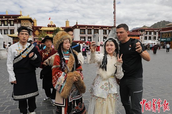 9月2日,西藏拉薩市八廓街,來自俄羅斯的巴德里(右一)與身穿藏族傳統服裝的年輕游客合影留念。近年來,來拉薩旅游,到八廓街、布達拉宮廣場拍一套藏服寫真,已經成為進藏旅游年輕人的“標配”。中青報·中青網記者 孔斯琪/攝