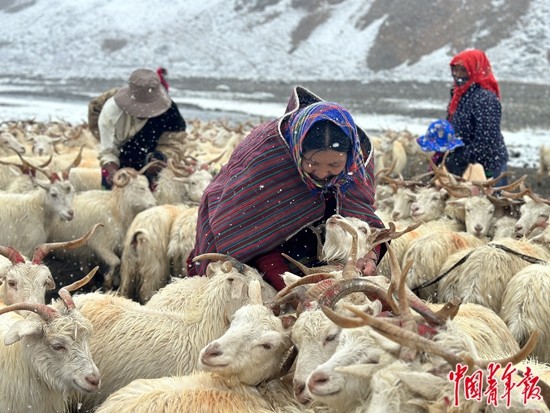 9月13日,西藏阿里地區(qū)日土縣熱幫鄉(xiāng)龍門卡村迎來了一場雪。在海拔近4800米的龍門卡村夏季牧場,牧民們把待擠奶的白絨山羊依次用繩子拴起來。中青報·中青網記者 石佳/攝