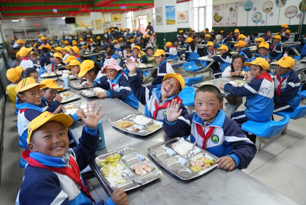 娘蒲鄉(xiāng)中心小學(xué)的學(xué)生們在享用午餐(9月3日攝)。新華社記者 晉美多吉 攝