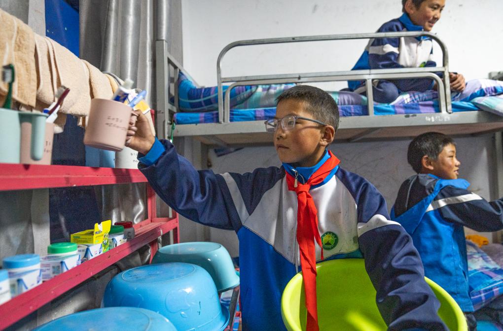 在娘蒲鄉(xiāng)中心小學(xué)宿舍里,貢喬熱旦準(zhǔn)備洗漱,所有洗漱用品都是免費(fèi)的(9月3日攝)。新華社記者 晉美多吉 攝
