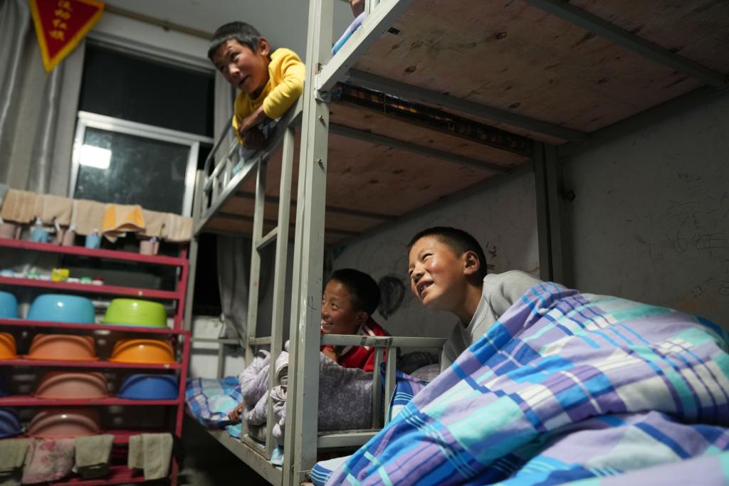 在娘蒲鄉(xiāng)中心小學(xué),貢喬熱旦(右下)就寢前和舍友閑談(9月3日攝)。新華社記者 晉美多吉 攝