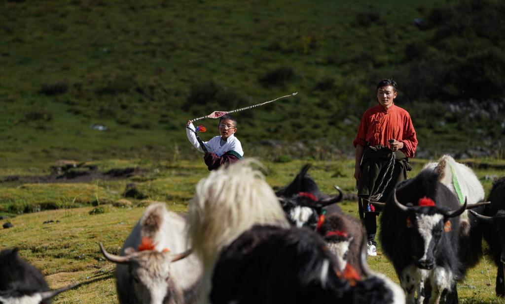 貢喬熱旦(左)和父親王登在自家的夏季牧場放牧(9月4日攝)。新華社記者 晉美多吉 攝