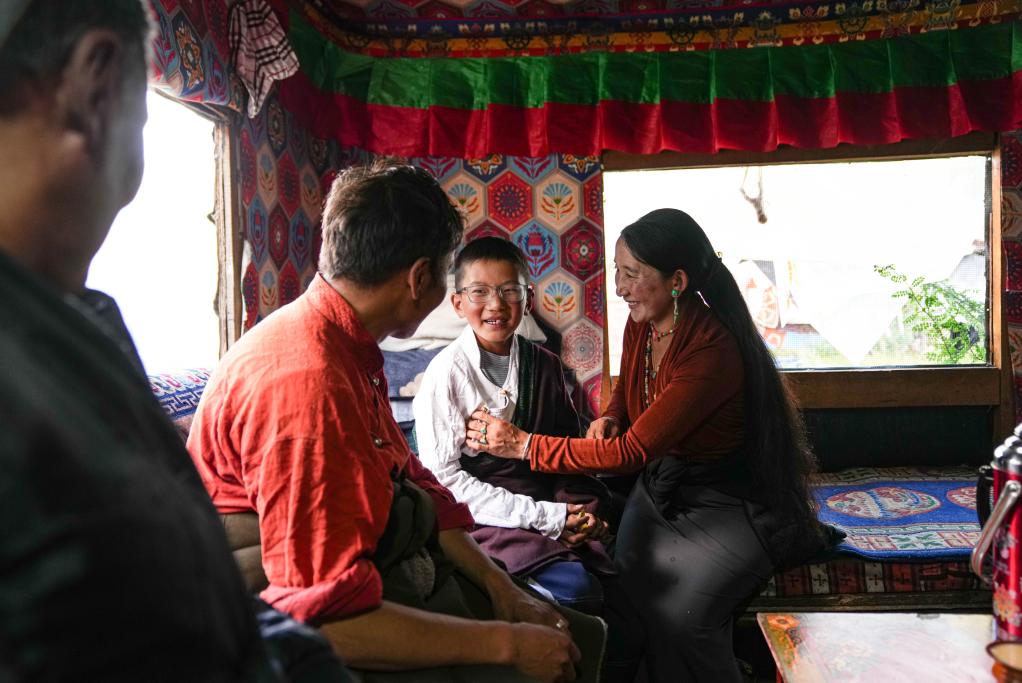 在夏季牧場的房子里,貢喬熱旦的母親阿吉(右一)整理兒子的藏裝(9月4日攝)。新華社記者 晉美多吉 攝