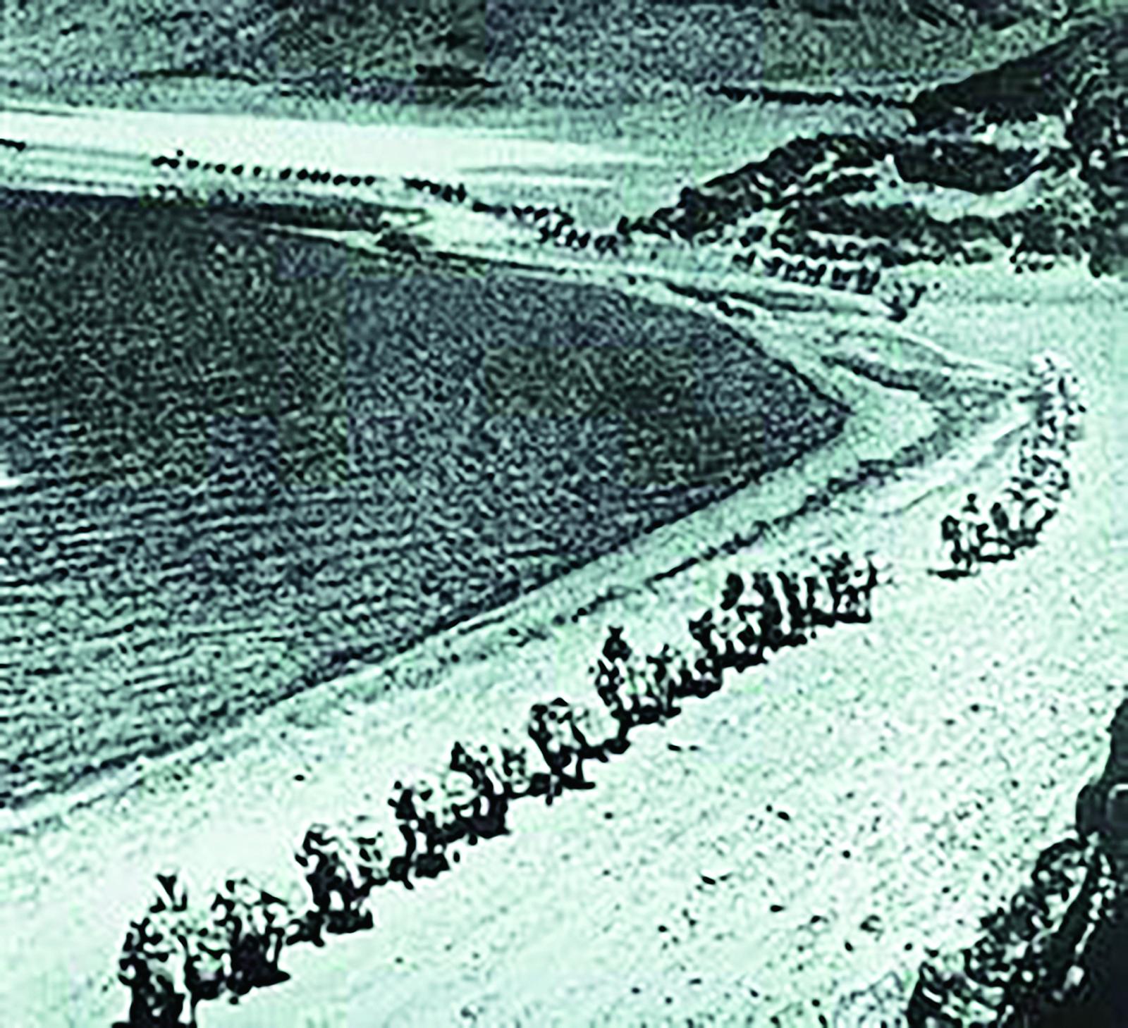 唐古拉山南側(cè)是起伏的羌塘草原,位于昆侖山脈、岡底斯山脈和唐古拉山脈之間。至此,青藏公路已經(jīng)完成青海境內(nèi)工程修筑,進(jìn)入西藏境內(nèi)施工階段。施工隊(duì)一路沿緩坡直下施工,僅用10天,就修到安多北部的桃兒久山下。在這里,筑路工程隊(duì)與西北軍區(qū)派來(lái)的1000名增援工兵相會(huì),兩路大軍匯合提速工程進(jìn)度。