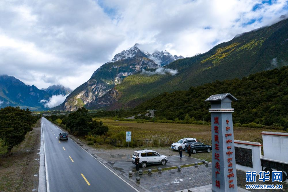 10月11日拍攝的波密通車紀念廣場(無人機照片)。2020年,西藏波密縣通過查閱文獻史料、比對老照片、咨詢當?shù)乩先恕⑦h程連線老一輩同志等方式,考證出當時舉行通車典禮的地點為今波密縣松宗鎮(zhèn)角達村國道318旁。為紀念這一歷史事件,2021年4月波密縣在此處修建了波密通車紀念廣場。新華網 旦增努布 攝