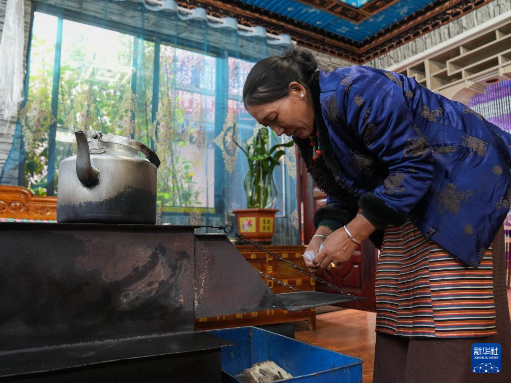 紐林塘村村民格桑卓瑪在家中生火(10月14日攝)。新華社記者 丁汀 攝?