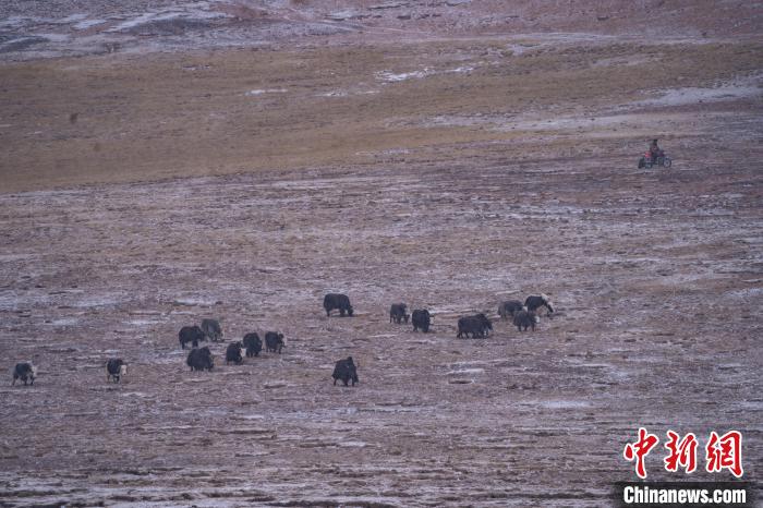10月23日,西藏自治區(qū)那曲市安多縣多瑪鄉(xiāng)牧民在雪中放牧。當(dāng)日,一場(chǎng)雪將藏北草原裝扮得如詩(shī)如畫(huà)。牧民們?cè)谶@銀裝素裹的天地間,開(kāi)始了雪中放牧的生活。牛羊在雪地中悠閑覓食,牧民駕駛著摩托車,在雪中放牧,形成了一幅動(dòng)人的風(fēng)景畫(huà)。圖為牦牛在草原上覓食。中新社記者 貢嘎來(lái)松 攝