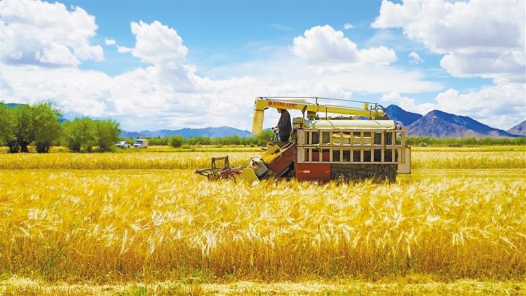 在白朗縣巴扎鄉(xiāng),沿著國道兩邊一幅金黃色的高原“豐收”畫卷徐徐鋪展開來。在巴扎鄉(xiāng)金嘎村,縣農(nóng)牧綜合服務(wù)中心的旦增這兩天也把辦公室搬到了田間地頭,指導(dǎo)當(dāng)?shù)厝罕姷那锸展ぷ??!霸谌镩_展之前,我們組織農(nóng)機(jī)合作社的農(nóng)戶進(jìn)行農(nóng)機(jī)具維修保養(yǎng)工作,并對成熟區(qū)域采取了成熟一片收割一片的收割方式,今年全縣糧食播種面積12.74萬畝,預(yù)計(jì)糧食產(chǎn)量持續(xù)穩(wěn)定在5萬噸以上?!钡┰鼋榻B道。
