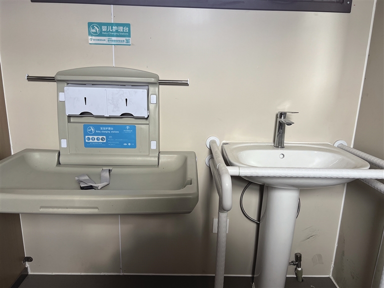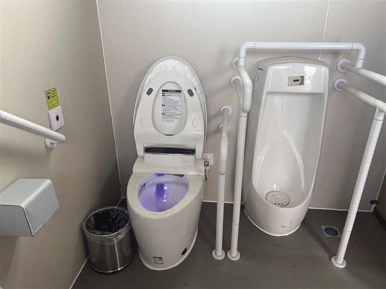 公廁內(nèi)部除了正常的蹲位,還設(shè)有第三衛(wèi)生間。第三衛(wèi)生間內(nèi)配有嬰兒護(hù)理臺(tái)、嬰兒安全座椅等設(shè)施。除此之外,第三衛(wèi)生間還設(shè)有安全扶手、智能馬桶等設(shè)備,方便腿腳不方便的老年人及殘疾人。智能馬桶旁還安裝有緊急報(bào)警器?!叭绻欣先嗽趲梗涂梢园匆幌戮o急報(bào)警器。這也是我們考慮到殘疾人、老年人如廁不方便,增設(shè)的人性化設(shè)計(jì)?!背嗔姓f。