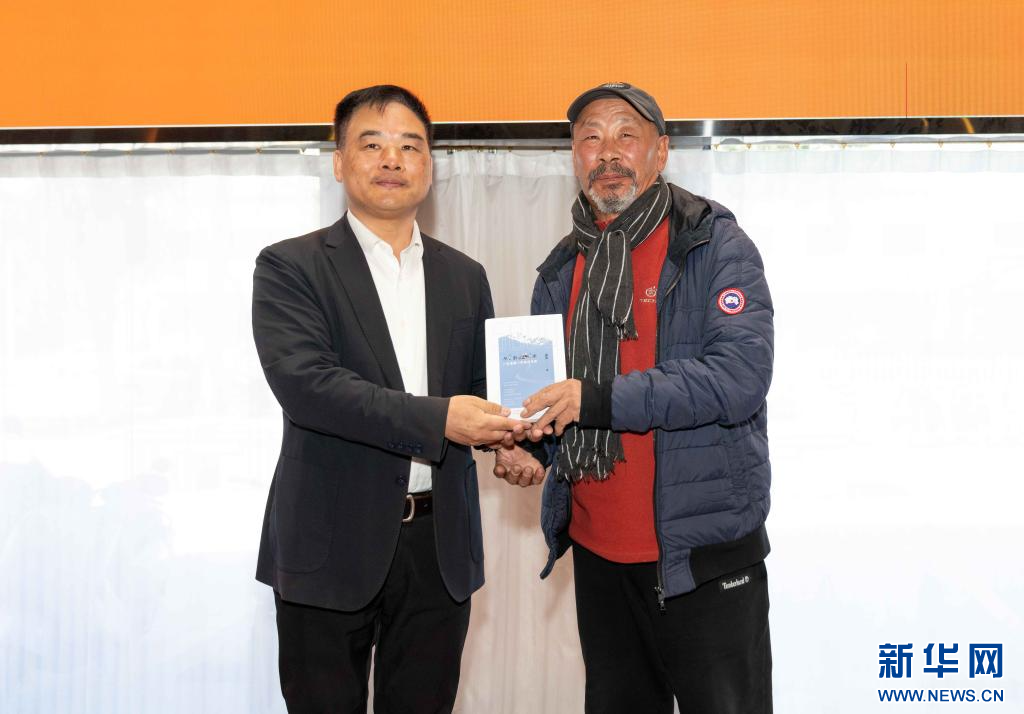 作者余風(左)向蒞臨的嘉賓贈書留念(11月9日)。新華社記者 旦增尼瑪曲珠 攝