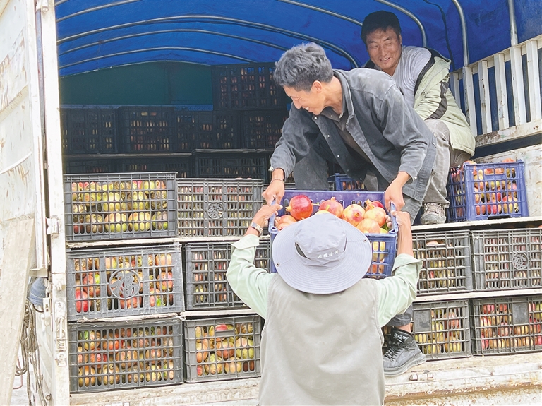 圖為昌西村果農(nóng)將石榴裝車(chē),準(zhǔn)備外運(yùn)銷(xiāo)售?!∮浾摺鳌⊥ㄓ崋T 吳子偉 攝