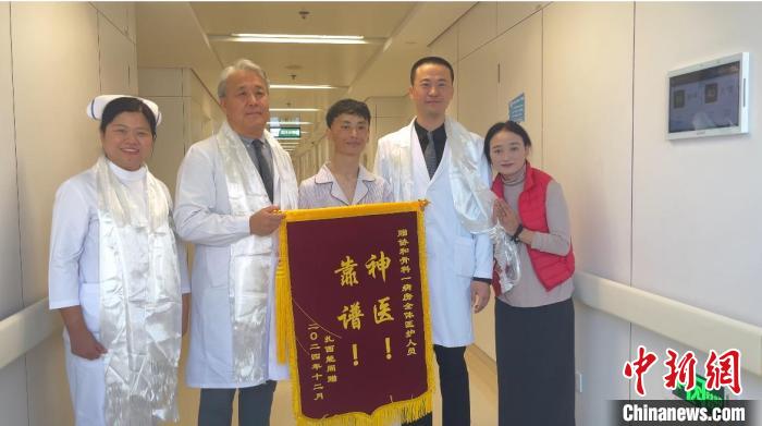 12月3日,在北京協和醫(yī)院接受脊柱側彎矯形手術的藏族青年扎西能周(右三)和母親(右一)向醫(yī)院骨科一病房的醫(yī)護人員獻哈達并送上錦旗。黃欣欣 攝