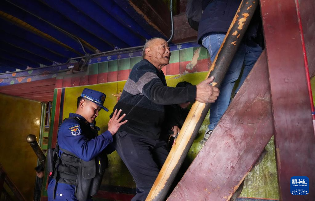 12月5日,布宮消防救援大隊(duì)隊(duì)員協(xié)助群眾上樓梯。新華社記者 晉美多吉 攝
