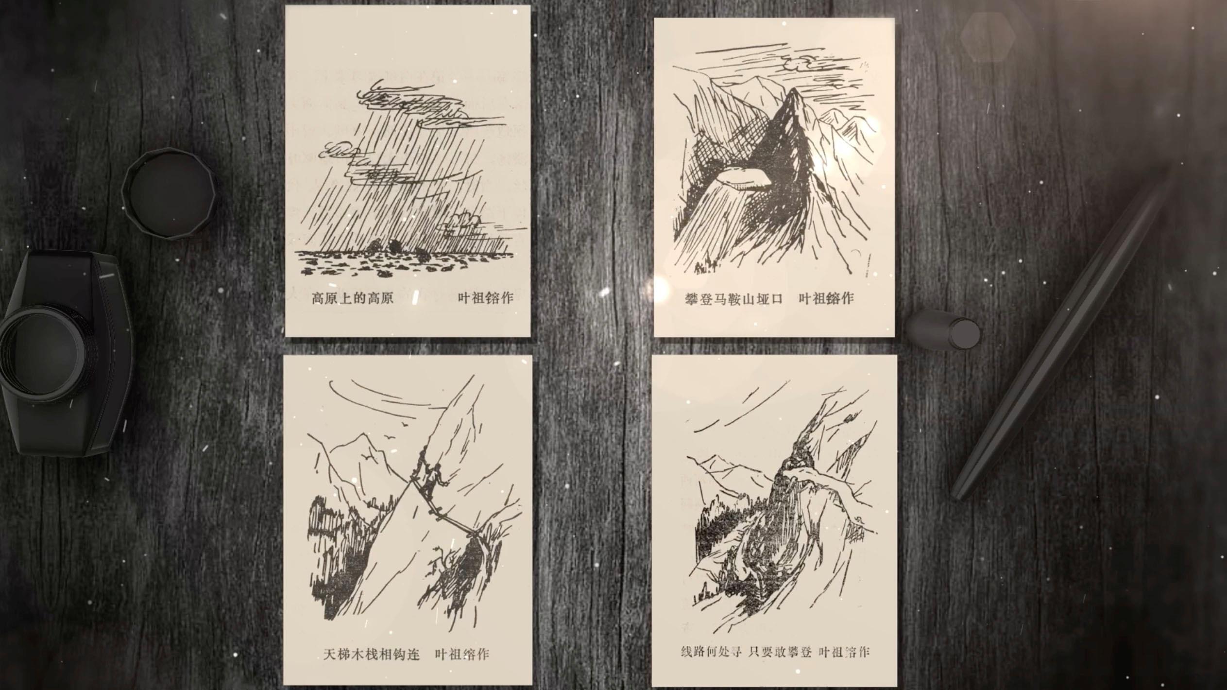 畫稿的作者是葉祖镕。他是踏勘隊中負(fù)責(zé)地形圖測繪的成員。在隊長余炯帶領(lǐng)下,深入無人區(qū)進(jìn)行勘測,與筑路大軍幾近失聯(lián)數(shù)月,但最終冒著生命危險帶回了寶貴的勘測報告。這是葉祖镕當(dāng)年畫的素描畫,高原上的高原、雪山頂?shù)膱嚎?、絕壁間的天梯、險峰中的窄路、踏勘隊沿途經(jīng)歷的各種地形,保留在這四張手繪中,它們見證著在生死之間,踏勘隊員的樂觀豁達(dá)、無所畏懼。