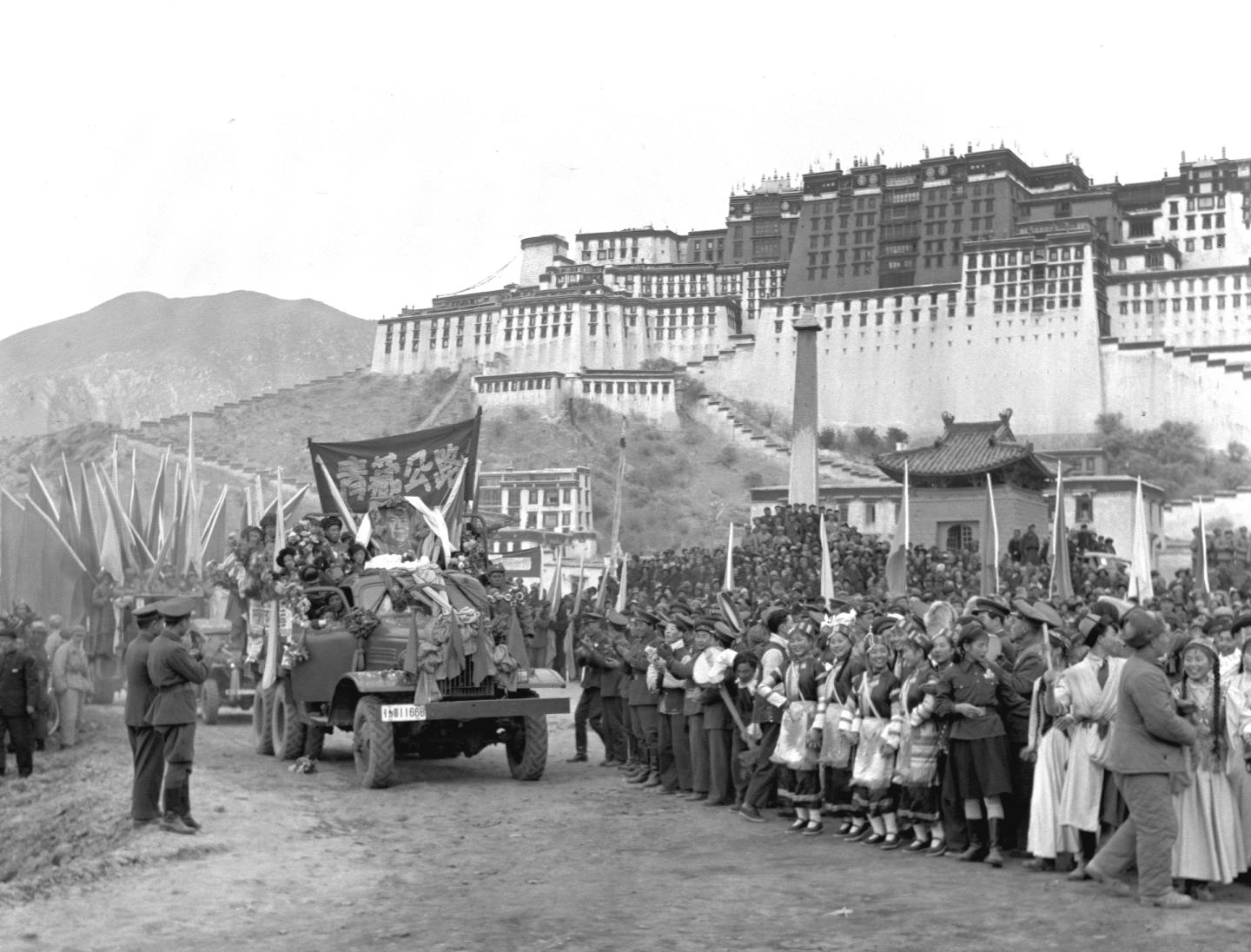 1954年12月25日,在西藏拉薩布達(dá)拉宮前舉行的通車典禮上,拉薩市群眾歡迎從青藏公路開到拉薩的汽車隊(duì)。