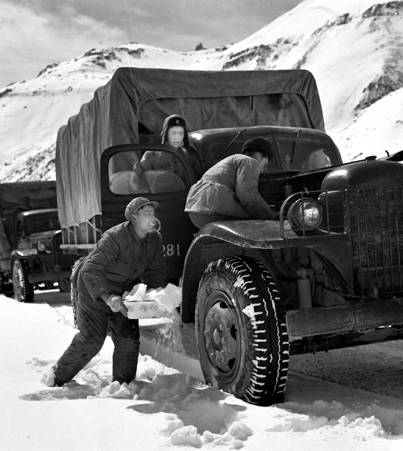 1964年,解放軍一個(gè)汽車連隊(duì)的駕駛員在川藏公路上用洗臉盆端雪去冷卻油泵。