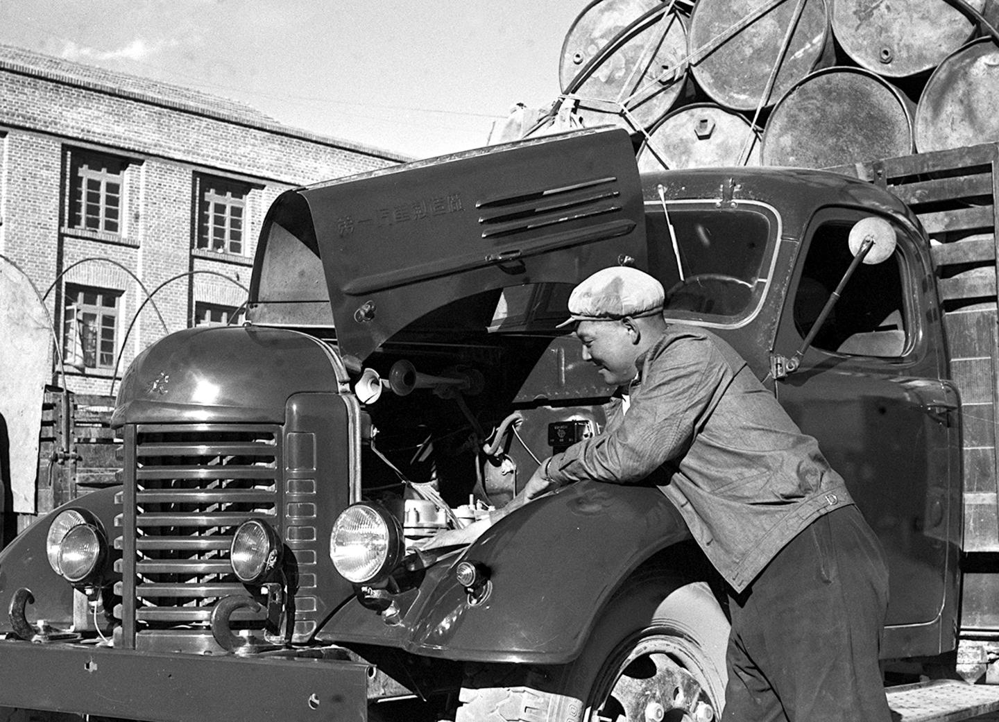 1964年,曾經(jīng)是川藏公路筑路工人的汽車駕駛員呷瑪卻桑在出車前對汽車機(jī)件進(jìn)行檢查?!?/p>