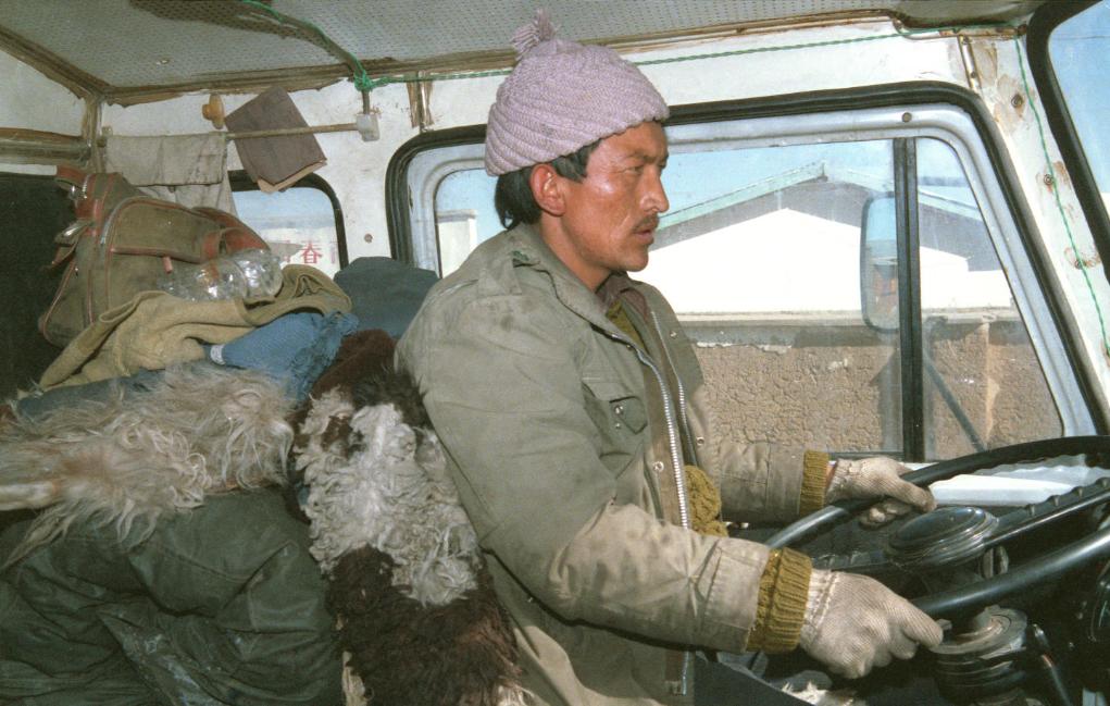 1989年拍攝的長年駕車奔馳在青藏公路上的藏族司機(jī)。