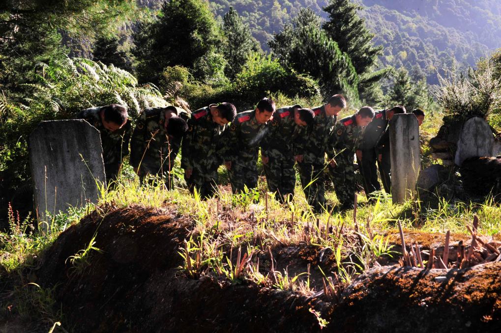 2014年9月18日,武警交通二支隊(duì)的官兵在波密縣烈士陵園祭奠烈士。在川藏公路沿線的許多地方,都有為當(dāng)年筑路部隊(duì)和當(dāng)代護(hù)路部隊(duì)因公犧牲的烈士所建的陵園。