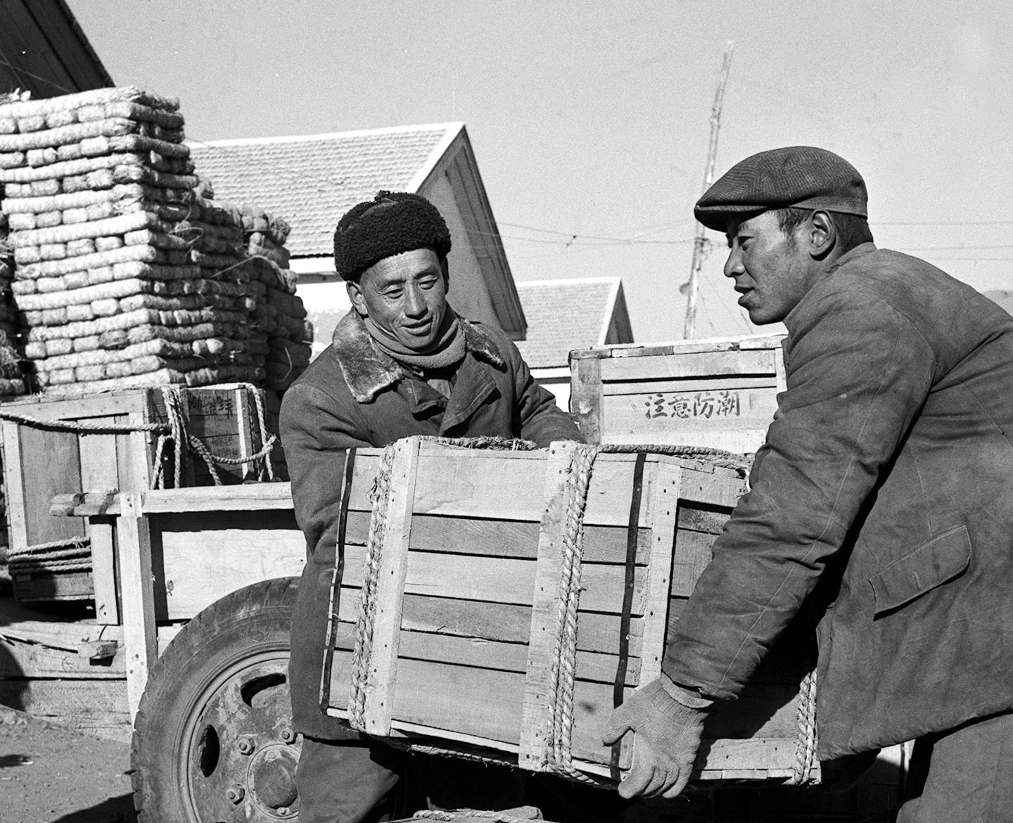 1964年,西藏山南貿(mào)易部門的工作人員在卸貨。不少生活用品沿著青藏公路和川藏公路源源運(yùn)進(jìn)西藏。
