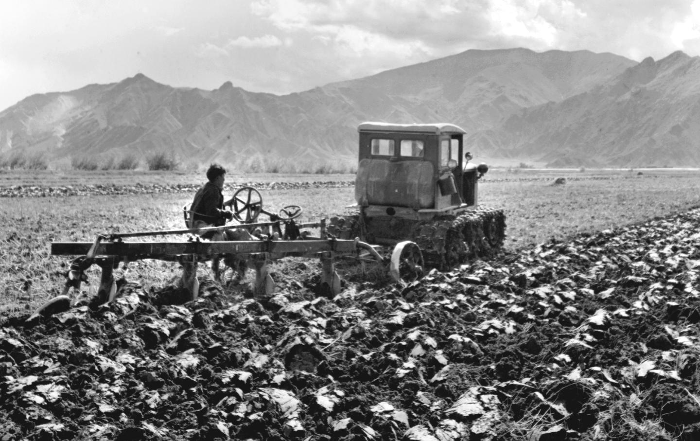 1964年,農(nóng)民使用拖拉機(jī)在拉薩郊外進(jìn)行秋耕。青藏公路和川藏公路通車后,許多新式農(nóng)具通過公路運(yùn)到了西藏。