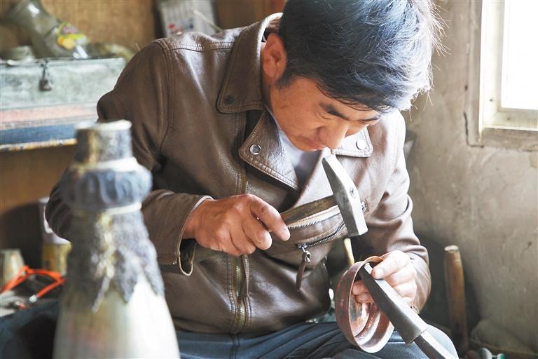 如果說(shuō)唐卡繪畫是嘎瑪鄉(xiāng)的藝術(shù)名片,那么銅像鍛造無(wú)疑是其底蘊(yùn)深厚的工藝招牌。從唐卡畫院出來(lái),沿著村中小路前行,清脆的敲銅聲如動(dòng)聽(tīng)的旋律吸引著人們。走進(jìn)一家以家庭式的銅像鍛造作坊,記者見(jiàn)到了正在忙碌的銅像鍛造師丁巴曲培。