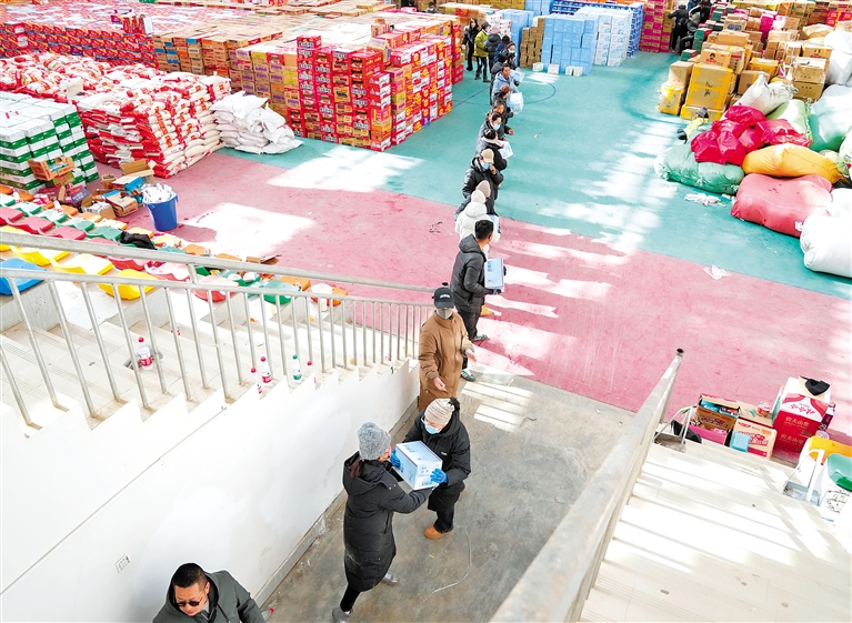 圖為1月8日,在定日縣人民政府的救援物資點,干部群眾接力傳遞救援物資。新華社記者 丁汀 攝