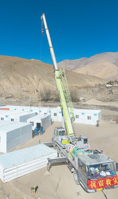1月9日,在定日縣長所鄉(xiāng)古榮村安置點,施工人員抓緊搭建移動板房。人民網(wǎng)記者 翁奇羽攝