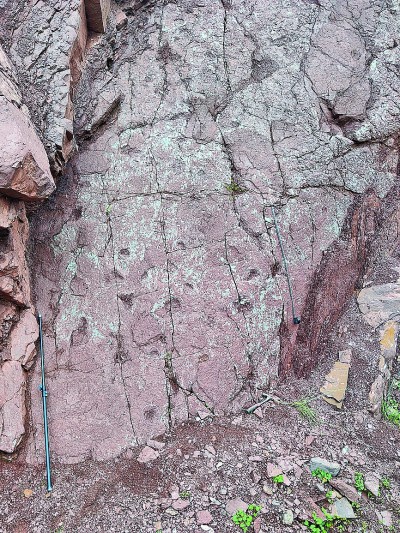 西藏昌都位于青藏高原東部,據(jù)介紹,此研究區(qū)的侏羅紀(jì)地層最大厚度超過4800米,巨大的沉積厚度促進(jìn)了大量化石的發(fā)現(xiàn),其中就包括恐龍足跡化石。2023年7月,中國地質(zhì)調(diào)查局自然資源實(shí)物地質(zhì)資料中心項目組于昌都開展工作時,在凍多村一段鄉(xiāng)村道路兩側(cè)的石壁上發(fā)現(xiàn)了疑似爬行動物腳印,隨即與遺跡學(xué)專家合作組成考察隊開展研究。該足跡化石點(diǎn)頂部為灰?guī)r,由紫紅色砂巖間夾頁巖、黏土巖組成,含有植物化石、遺跡化石和少許腕足、介形類和海百合莖等化石,總體屬于海陸交互環(huán)境??疾礻犜诳铸堊阚E所在層面與相鄰層面還發(fā)現(xiàn)了如古藻跡、石針跡等遺跡,這些發(fā)現(xiàn)代表這個地方曾是淺水環(huán)境。因此,研究證明,良好的環(huán)境和豐沛的水資源吸引了恐龍等動物在此活動,并留下豐富的足跡化石。