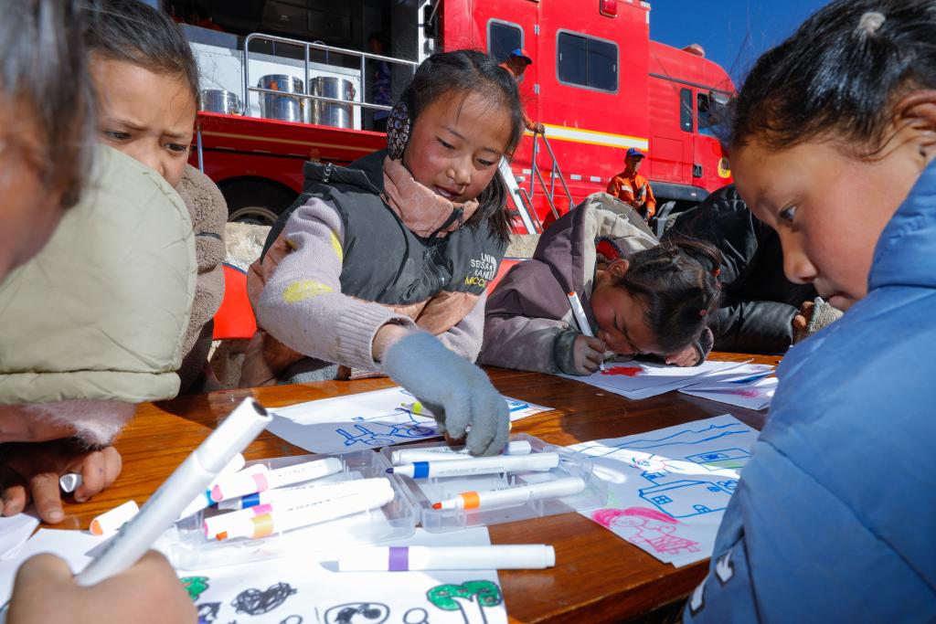 1月11日,在定日縣曲洛鄉(xiāng)措昂村臨時安置帳篷間的空地上,孩子們在畫畫。(新華社記者 沈伯韓 攝)