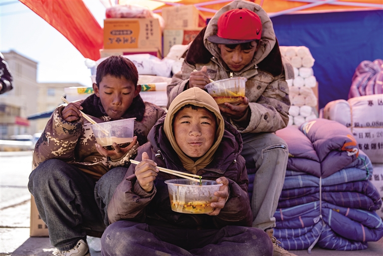 在長所鄉(xiāng)森嘎村安置點,來自定日縣崗嘎鎮(zhèn)的普桑和其他3名村民正在給受災(zāi)群眾與救援人員分發(fā)“巴突”(藏語音譯,意為面疙瘩)。“今天上午我們做的‘強歸’(藏語音譯,意為煮青稞酒和糌粑),中午做的‘巴突’,這是我們的傳統(tǒng)美食,吃了全身都會暖乎乎的。大家互幫互助,一切都會慢慢好起來的?!逼丈Uf。