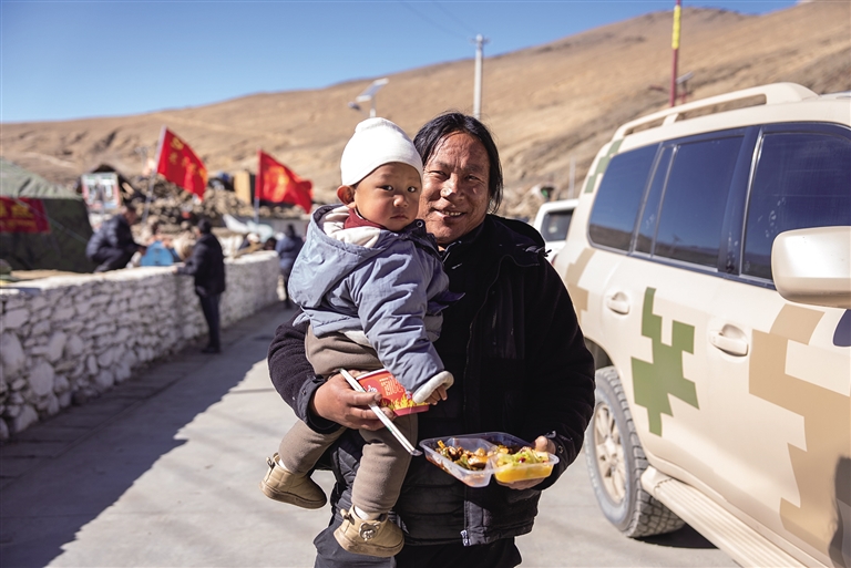 在定日縣措果鄉(xiāng)的愛心人士為當?shù)厥転?zāi)群眾提供免費熱食。