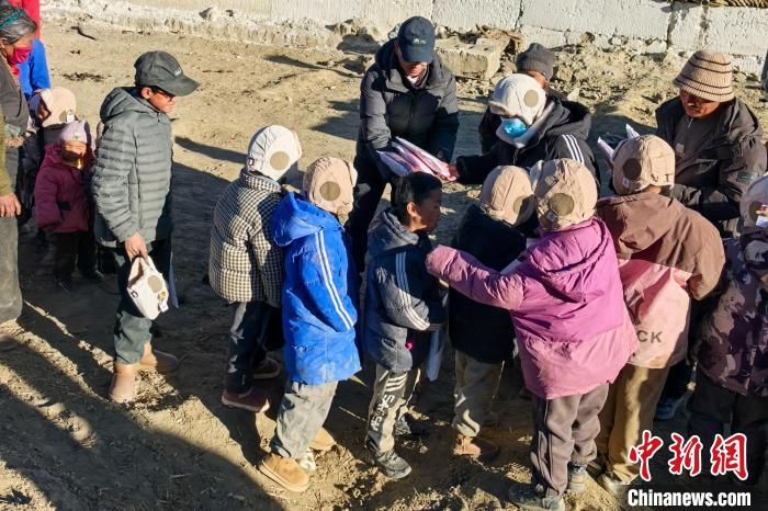 圖為1月12日,桑杰尼瑪將同事們籌款購(gòu)買的保暖帽分發(fā)給村里的孩子們。受訪者 供圖