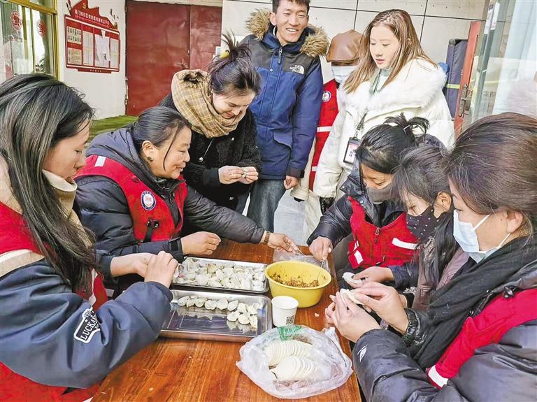 上圖:1月27日,拉薩市城關(guān)區(qū)策門(mén)林社區(qū)工作人員與居民一起包餃子。