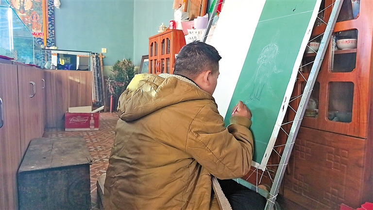 洛追正在畫(huà)唐卡。