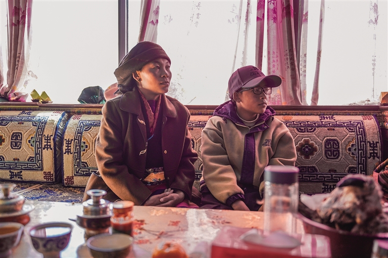 當(dāng)日,天空晴朗,在廣袤無垠、無樹木遮擋的曠野上,稍起一陣疾風(fēng),便會揚(yáng)起一層薄薄的黃沙。從村委會出發(fā),沿著冰湖畔的水泥小路前行,很快就來到了村民倫珠曲珍的家。一進(jìn)屋,厚實的木門便將凜冽的寒風(fēng)擋在了門外?!翱煺堖M(jìn),這幾天風(fēng)沙有點大,普莫雍措都沒以前藍(lán)了?!眰愔榍湟贿呹P(guān)門一邊熱情地笑著說道。