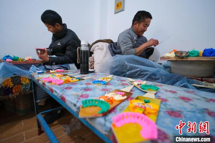 2月20日,來(lái)自日喀則仁布縣康雄鄉(xiāng)的次旺(右)和小兒子土旦桑布捏制酥油花。 中新社記者 江飛波 攝