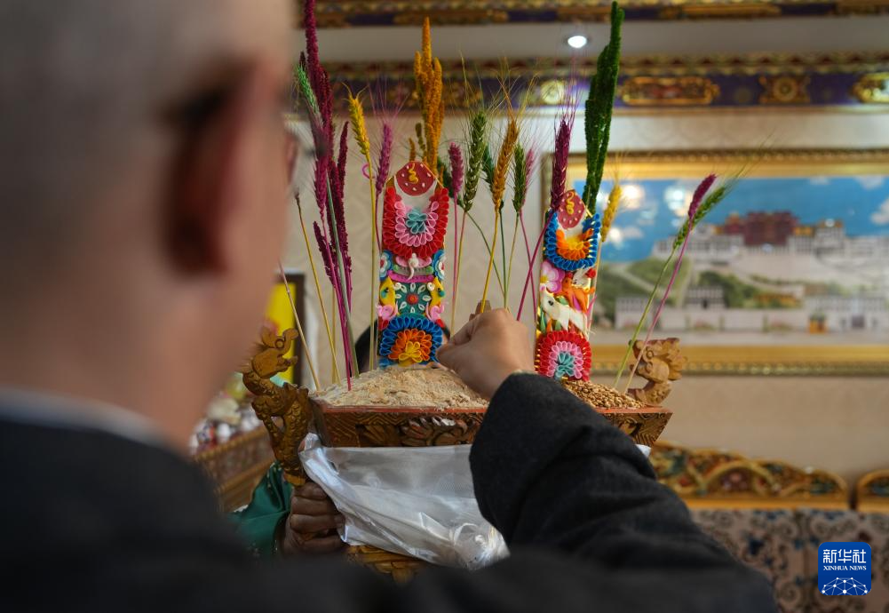 2月28日,身著藏裝的拉薩市民在吃寓意五谷豐登的“切瑪”。