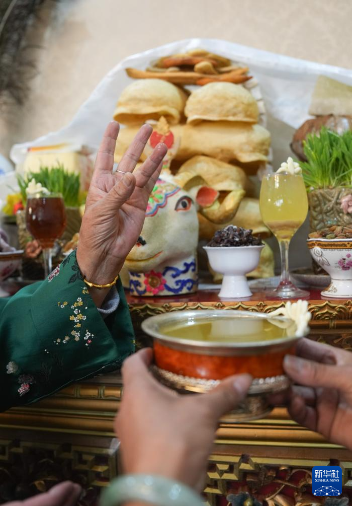 2月28日,身著藏裝的拉薩市民在敬獻(xiàn)青稞酒。新華社記者 晉美多吉 攝